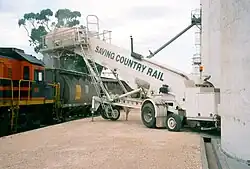 Despite the huge improvement brought about by bulk handling, conventional outloading equipment at the country silos on Eyre Peninsula only filled rail wagons at up to about 200 tonnes per hour. In 2003, a mobile fast loader was developed to fill rail wagons at 1000 tonnes per hour, allowing a full-length train to be loaded at one location in a couple of hours.[2]: 119