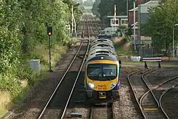In 2003, the Wensleydale Railway signed a 99-year lease with Railtrack (the predecessor of Network Rail) and started services on the former Wensleydale line.[74] Initially, trains ran to Leeming Bar as the eastern terminus, but in 2014 Northallerton West railway station opened. It is a temporary structure as the Wensleydale Railway was keen to reopen the closed 1970 curve and run trains into, or as close as possible to, Northallerton station. The north-facing bay platform used for the Wensleydale branch has been filled in and is part of the car park.[75] The section between Leeming Bar and Northallerton does not see scheduled services as the level crossing on Yafforth road is in need of upgrading. In 2016, a train struck a car on the level crossing,[76] and while the report did not attribute direct blame on the company, it said that the approaches and sighting of the level crossing should be improved.[77][note 4][78]