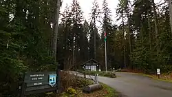 Due to the park's location on the Chehalis River, the site has experienced several floods and subsequent damages. The footbridge was nearly destroyed during a buildup of a log jam during the 1972 Lewis County Flood; the height of the log jam exceeded the top of the bridge.[10] In 2007, the park suffered severe flooding which destroyed the footbridge, other bridges along the Willapa Hills Trail, as well as the park's main entrance.[11] Damages were listed at $6.5 million and visitors began using an alternate entrance to the park in 2008.[12][13] The revised entrance was constructed at the location of the original CCC gateway and by 2011, the kitchen area and picnic areas, including playgrounds, were restored.[14]