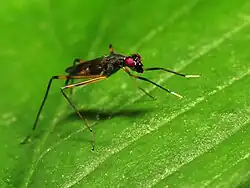 Rainieria antennaepes is a species of stilt-legged flies in the family Micropezidae found in North America east of the Rocky Mountains. The name "antennaepes" means "antenna foot". They frequently hold their white-tipped front legs up and wave them around in a manner that makes them appear like the antennae of ichneumonid wasps. They feed on detritus, bird droppings, and similar waste.[1][2][3][4]