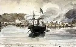 Upon finding that Haji Saman was living in Membakut and that he was involved in the plotting that caused Hashim's death, HEICS Phlegethon and HMS Iris departed there destroyed Haji Saman's house and captured the town of Membakut although Saman managed to escape.[54] Brooke returned again to Brunei and finally managed to induce the Sultan to return to the capital where the Sultan wrote a letter of apology to Queen Victoria for the killings of Hashim, his brother and their family.[56] Through his confession, the Sultan recognised Brooke's authority over Sarawak and mining rights throughout the territory without requiring him to pay any tribute as well granting the island of Labuan to the British.[56] Brooke departed Brunei and left Mumin in charge together with Mundy to keep the Sultan in line until the British government made a final decision to acquire the island. Following the ratification agreement of the transfer of Labuan to the British, the Sultan also agreed to allow British forces to suppress all piracy along the coast of Borneo.[56]