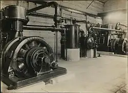 In 1894, while plans for electric street lightning were being drawn up in Penang and Kuala Lumpur on the Malay Peninsula, Rajah Charles Brooke refused to adopt this new technology because of his dislike of "new-fangled things". The sparse population of Sarawak also presented a logistical challenge to install power stations and connecting cables.[143] However, wired telephones were installed around Kuching in 1898 for keeping up to date communications with the outstations. Otherwise, messages from the northernmost areas of the state such as Limbang and Baram could take up to a month to reach Kuching. Besides, telephones were cheap to install and required little power. By 1908, the Mukah-Oya region was connected to telephone lines, followed by Miri in 1913, and Sibu in 1914.[144] The first wireless telegraphy station was erected in Kuching in 1917, followed by Sibu and Miri immediately thereafter.[145] It was not until 1914 that the first electrical power stations were installed in Miri by Anglo-Saxon Petroleum Company and Bau by the Borneo Company Limited. The oil production boom in Miri and gold mining in Bau gave rise to the need of more efficient lightning and motor systems. Cinematography also began that year in Miri.[146] In 1920, J. R. Barnes, the manager of the Sarawak Government Wireless Telegraphs and Telephones Department, proposed an electrical lightning scheme for Kuching using a coal-fired system. In January 1923, a power station covering an area of 620 square metres (6,700 sq ft) was completed at Khoo Hun Yeang Street, Kuching, and started operation in June 1923, supplying Kuching with a direct current (DC) system.[147] Today the road where the power station was once located is now known as the "Power Street".[148][149] Sibu's first power station was installed in 1927, followed by Mukah in 1929.[150] From 1922 to 1932, the electrical supply in Kuching was managed by the Electrical Department, under the jurisdiction of Public Works Department. This department was then privatised as the Sarawak Electricity Supply Company.[151] From the 1930s, a telegraph line connected the country with Singapore.[152] Wireless telegraph stations were located in all major towns in Sarawak.[111] Postal service was also available throughout the administration.[153]