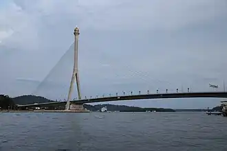 The Raja Isteri Pengiran Anak Hajah Saleha Bridge (Malay: Jambatan Raja Isteri Pengiran Anak Hajah Saleha; Jawi: جمبتن راج استري ڤڠيرن انق حاجه صاليها), also commonly known as Sungai Kebun Bridge (Jambatan Sungai Kebun), is a cable-stayed bridge which connects the Pusat Bandar and Mukim Lumapas in Bandar Seri Begawan, Brunei. It is named after Queen Saleha, the queen consort of the current Sultan Hassanal Bolkiah. Officially inaugurated on 14 October 2017,[7][8] it became the country's first cable-stayed bridge,[6] and its tower has since been the tallest structure.[2]
