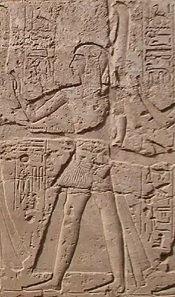 He is attested in numerous inscriptions including the Egyptian 'triumph' scenes after the Battle of Kadesh.[2] Ramesses bears the titles of Royal scribe, Generalissimo and "bodily King's Son beloved of him", and is shown presenting the "Maryannu-warriors of the despicable Naharina" to the gods as spoils of war. In scenes from the battle of Qode in year 10 at Luxor, the princes Amunherkhepeshef, Ramesses, Pareherwenemef and Khaemwaset are shown leading prisoners before their father the king.[3]