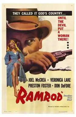 Ramrod is a 1947 American Western film directed by Andre de Toth and starring Joel McCrea, Veronica Lake, Preston Foster and Don DeFore. This cowboy drama from Hungarian director de Toth was the first of several films based on the stories of Western author Luke Short. De Toth's first Western is often compared to films noir released around the same time. Leading lady Veronica Lake was then married to director de Toth. The supporting cast features Donald Crisp, Charles Ruggles, Lloyd Bridges and Ray Teal.