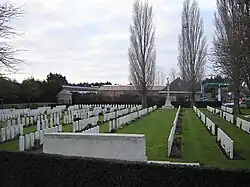 Currently, there are 841 Commonwealth casualties of World War I who are either buried or commemorated in Ramscappelle Road Military Cemetery. Of those, 312 are unidentified. Included in that number are 26 special memorials to those initially interred at Nieuport or Nieuport-Bains, and whose graves were destroyed in battle.[1] In addition to the above, 2 unidentified Foreign National burials are present, for a total of 843 graves in the cemetery. There are 529 identified casualties at Ramscappelle.[9] Among those interred in the cemetery are World War I British flying aces Lieutenant Lionel Ashfield and Captain Harold Mellings.[10][11][12][13]