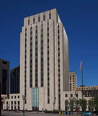 The Saint Paul City Hall and Ramsey County Courthouse, located at 15 Kellogg Boulevard West in Saint Paul, Ramsey County, in the U.S. state of Minnesota, is a twenty-story Art Deco skyscraper completed in 1932. Built during the Great Depression—a period of high unemployment and falling prices—the building's four-million-dollar budget was underspent, resulting in higher quality materials and craftsmanship than initially expected.