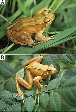 - ^ a b c d Wang, Chencheng; Qian, Lifu; Zhang, Chenling; Guo, Weibo; Pan, Tao; Wu, Jun; Hui, Wang; Zhang, Baowei (2017-12-12). "A new species of Rana from the Dabie Mountains in eastern China (Anura, Ranidae)". ZooKeys (724): 135–153. Bibcode:2017ZooK..724..135W. doi:10.3897/zookeys.724.19383. ISSN 1313-2970. PMC 5769725. PMID 29362536.