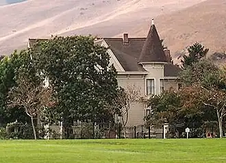 The Hiram Corey mansion is a three-story, wood-frame, single-family residence built in a Queen Anne style. It is the best example of Queen Anne style of architecture in a rural setting in Monterey County. It has redwood siding, banded with fish-scale shingles halfway into the second story, with a hipped roof and tower with a brass eagle finial detail. Full bay windows can be seen on the first and second stories. The main entrance to the house has stairs leading up to double wood doors with a Queen Anne style wood railing and canopy. Some of the original palm trees line the entrance. A small one story carriage house remains at the rear of the house.[2]