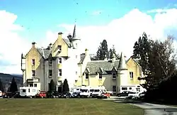 He is buried at a private grave site by the burn adjacent to the house. The building is a romantically styled Scots Baronial mansion house designed by architects Thomas Mackenzie and James Matthews. Prior to being purchased by the school, it was used as offices by the Forestry Commission.