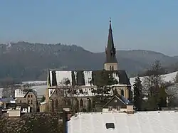 The main landmark of Rapotín is the Church of the Assumption of the Virgin Mary. It is a neo-Gothic church built in 1874, which replaced an old wooden building from the 16th century. It has a 50 m (160 ft) high tower. The church is equipped with a pipe organ made by the Rieger Orgelbau company.[8]