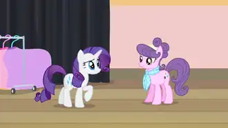 During the contest, Rarity realizes her friends are not present in the audience and has an epiphany about how poorly she treated them, and rushes back to the hotel to apologize ("Generosity (reprise)"). She discovers they did not leave for Ponyville but simply overslept, and though Suri claims Rarity lost the competition, she focuses on making amends by arranging a private showing of Hinny of the Hills for the group. After the musical, Suri's assistant Coco Pommel reveals that Rarity actually won the contest but that Suri tried to claim victory by default. Coco presents her with the rightful trophy and a gift box containing rainbow-colored thread, and Rarity endorses Coco as dressmaker for her friend's next theater show, which she accepts.