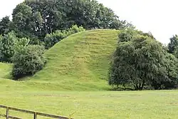 Cist burials of possible Bronze Age date were excavated within the motte in 1893-1894; the mound may contain an early Bronze Age tumulus.[26][27] A bronze bracelet was recovered near the motte in 1905.[28] Newtownpark contains a ring-barrow of Bronze Age date, a Bronze Age cist burial was excavated in Hempstown Commons in 1950, and a cinerary urn burial of Late Bronze Age date was excavated in Athgarrett in 1983.[29][30][31] Iron Age cremated remains were recovered within a pit-burial a short distance west of the motte in 1998.[32][33]