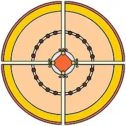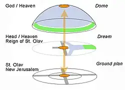 Early researchers noted the debt Rauðúlfs þáttr owed to the dream of Nebuchadnezzar in the Old Testament. His dream was of a huge image made of various materials (gold, copper, iron, etc.). The prophet Daniel interpreted it to stand for the rise and fall of world powers (Chapter 2). The likeness of events at the feast with a similar but much exaggerated narration in the French chanson de geste Voyage de Charlemagne à Jérusalem et à Constantinople[3] was also noted.[4][5] Both stories also feature a round and rotating house. The round house in the French song has been compared with “abodes of the Sun” in Greek medieval romances.[6][7] Later studies indicate that Rauðúlfs þáttr is an allegory that uses a host of symbolic imagery of cosmological nature to manifest the holiness of King Olav (=Saint Olav).[8][9] The round house can be seen as a prefiguration of the Church[10] and an image or model of the universe. The crucifix is a reflection of the house in the same way as man was seen as a microcosmos, or mirror image, of the universe.[11][12] The central platform corresponds to the head, the decorations of the ceiling correspond to the body parts further away from the head. The author places King Olav in the central position of the house, in a bed surrounded by symbols of the New Jerusalem (4x3 lights), the symbolic seat of Christ.[13] The effect is a glorification or apotheosis of King Olav. As an image of the universe the house can also be envisaged as a symbolic man composed of a four-divided, earthly body and a heavenly, central and undivided soul (the central platform). As such this allegorical house might well have served as a tool for meditation. The symbolic imagery of Rauðúlfs þáttr is close to that used in the cosmological visions of Hildegard of Bingen,[14] both works represent a widespread tradition of cosmological imagery within the medieval church. Other examples of such imagery appear in church architecture, medieval architectural allegories in the literature,[15][16] the cave of love in Tristan and Isolde by Gottfried von Strassburg,[17] and as a cosmogram in Byrhtferth's Enchiridion.[18]