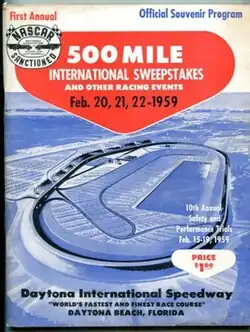 The 1959 First 500 Mile NASCAR International Sweepstakes at Daytona[2] (now known as the 1959 Inaugural Daytona 500) was the second race of the 1959 NASCAR Grand National Series season. It was held on February 22, 1959, in front of 41,921 spectators.[3] It was the first race held at the 2.5-mile (4.0 kilometer) Daytona International Speedway.[4]
