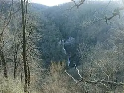 Raven Cliff Falls on Matthews Creek in Caesars Head State Park, Greenville County, South Carolina, is the tallest waterfall in South Carolina. Although the waterfall is described as having a 400-foot drop, topographic maps suggest a height between 320 and 350 feet.