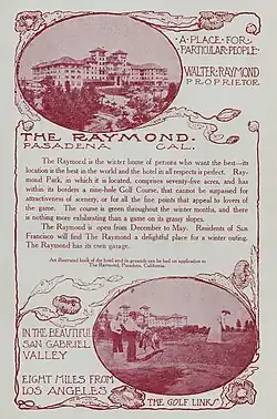 The Raymond Hotel was a hotel in South Pasadena, California, and first major resort hotel of the San Gabriel Valley. Largely a winter residence for wealthy Easterners, it was built by Mr. Walter Raymond of Raymond & Whitcomb Travel Agency of Boston, Massachusetts. The hotel was built atop Bacon Hill which lies between Pasadena and South Pasadena and was renamed Raymond Hill with the opening of the hotel in 1886. The original hotel, a grand and unequivocal Victorian edifice was burned to the ground in 1895. A second building, of a later and more fireproof style, was erected in 1901 and equally replaced the older in grandeur. The hotel was foreclosed following the Great Depression and was razed for commercial development.