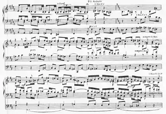 Max Reger was a composer whose dedication to Bach has been described as a "monomaniacal identification" by the musicologist Johannes Lorenzen: in letters he frequently referred to "Allvater Bach". During his life, Reger arranged or edited 428 of Bach's compositions, including arrangements of 38 organ works for piano solo, piano duet or two pianos, starting in 1895. At the same time he produced a large number of his own organ works. Already in 1894, the organist and musicologist Heinrich Reimann, reacting to modernist trends in German music, had encouraged a return to the style of Bach, stating that, "Beyond this style there is no salvation ... Bach becomes for that reason the criterion of our art of writing for the organ." In 1894–1895 Reger composed his first suite for organ in E minor which was published in 1896 as his Op.16 with a dedication "To the Memory of Johann Sebastian Bach". The original intention was a sonata in three movements: an introduction and triple fugue; an adagio on the chorale Es ist das Heil uns kommen her; and a passacaglia. In the final version, Reger inserted an intermezzo (a scherzo and trio) as the third movement and expanded the adagio to contain a central section on the Lutheran hymns Aus tiefer Not and O Haupt voll Blut und Bunden. In 1896, Reger sent a copy of the suite to Brahms, his only contact. In the letter he asked permission to dedicate a future work to Brahms, to which he received the reply, "Permission for that is certainly not necessary, however! I had to smile, since you approach me about this matter and at the same time enclose a work whose all-too-bold dedication terrifies me!" The overall form of the suite follows the scheme of the eighth organ sonata Op.132 (1882) of Joseph Rheinberger and the symphonies of Brahms. The final passacaglia was a conscious reference to Bach's organ passacaglia in C minor BWV 582/1, but has clear affinities with the last movements of both Rheinberger's sonata and Brahms' fourth symphony. The second movement is an adagio in ternary form, with the beginning of the central section directly inspired by the setting of Aus tiefer Not in the pedaliter chorale prelude BWV 686 of Clavier-Übung III, paying homage to Bach as a composer of instrumental counterpoint. It has a similarly dense texture of six parts, two of them in the pedal. The outer sections are directly inspired by the musical form of the chorale prelude O Mensch, bewein dein Sünde groß BWV 622 from the Orgelbüchlein.[b] The suite was first performed in the Trinity Church, Berlin in 1897 by the organist Karl Straube, a student of Reimann. According to a later account by one of Straube's students, Reimann had described the work as "so difficult as to be almost unplayable," which had "provoked Straube's virtuosic ambition, so that he set about mastering the work, which placed him before utterly new technical problems, with unflagging energy." Straube gave two further performances in 1898, in the cathedral at Wesel, where he had recently been appointed organist, and prior to that in Frankfurt, where he met Reger for the first time. In 1902, Straube was appointed organist at the Thomaskirche and in the following year cantor; he became the main proponent and performer of Reger's organ works.[90][91]