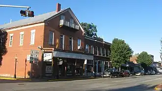 The city receives its name from the redbud tree, a species of flora that grows in the area. The first development by a European settler within what is now the city limits was made by Preston Brickey in 1820. He constructed a log cabin near the current intersection of Main and Power streets, and there cultivated a farm. In 1839, James Pollock placed a small stock of goods in the log cabin built by Henry Simmons, where he did business for about a year. This was located where Lutheran cemetery now exists. The next year he moved his stock of goods into a log building erected by John C. Crozier. He continued the business there about three years, when he moved to Preston. In 1840, R.D. Dufree became the first permanent merchant in Red Bud. Two years later he built a frame store house on the southeast corner of Main and Market streets. The first brick school house was erected in 1854, in the east part of town.[7]