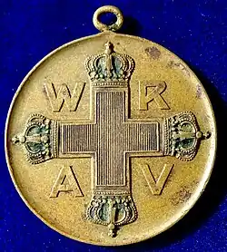 The Red Cross Medal was a German medal set up on 1 October 1898 by Wilhelm II. It had three classes and could be awarded to all those who carried out great service to the sick in peace or wartime, or for special achievement in the service of the German Red Cross. Though service to the sick during times of war had been recognized with prior awards of the Order of the Crown and General Honor Decorations with the Red Geneva Cross, Empress Augusta Victoria the royal patroness of the organization wanted an award to recognize work in peacetime as well.[3]