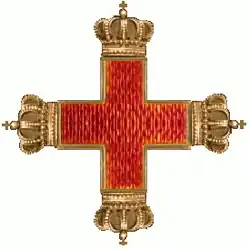 The Red Cross Medal, First Class was a Steckkreuz in the form of the red enameled Geneva cross in gilded silver. At the ends of the cross arms are gilded Prussian Royal Crowns. The red enamel bears a hatch pattern. The back is plain gilded silver except for the single vertical attachment pin on the back. The cross is 46.6 to 48.8 mm high and weighs 14 gm.[4]