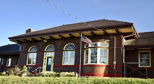 The single story, red brick structure, Late Victorian architectural style, is located on an embankment alongside the elevated tracks on the south side of town. It is .5-mile (0.80 km) south of where the previous depot was located.[2] Passenger service ended in 1971, and the railroad sought to demolish the depot in 1993. It was donated to the community in 1995, and added to the National Register of Historic Places in 1999.[1]