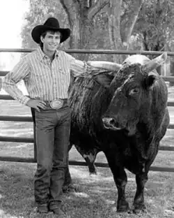 "Nobody knew the bull then." Kish said.[2] When he was 18 years old, Don Kish drew Red Rock at a rodeo in Silver Lake, Oregon.[5][2] He only lasted a couple jumps before being bucked off so hard he needed help finding his way back towards the chute.[5][2][4] Mert took Red Rock to the World's Toughest Rodeo in Tacoma, Washington, in 1982.[2] Jody Tatone drew him which started the cowboys talking about him.[2] Red Rock won many awards in this time and was named Bucking Bull of the Finals in the IPRA in 1983.[2] In 1983, Mert was allowed to put Red Rock in the draw for a PRCA rodeo.[5] Two top PRCA riders drew him and Red Rock bucked them both off.[5] After that, Mert knew Red Rock could buck at the PRCA level.[5] When Mert developed terminal cancer in 1984, he contacted John Growney of Growney Brothers Rodeo Company in Red Bluff, California.[3] He was looking for someone special to take care of Red Rock.[3] Mert had received many offers for Red Rock.[4] However, he had heard that Growney and his partner, Don Kish, had a reputation for taking outstanding care of their livestock.[3] Mert even financed the bull so that the guys could afford to buy him.[4] Growney said Mert would never had sold Red Rock if he hadn't been dying.[2] When Kish and Growney were looking over the stock Mert was selling, they "recognized Red Rock immediately [and] bought him that day in early 1984 for $10,000".[2]