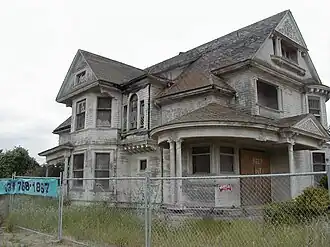 The house was constructed in 1897 and designed by William H. Weeks, who was responsible for the design of hundreds of unique buildings throughout California. It was a classic Queen Anne — it featured a rounded corner tower with a turret, gables with meticulously carved panels, Palladian windows and dentil molding. The intricate detailing that Weeks designed for the exterior of the home could also be found inside — expensive and decorative wood, including eastern oak and bird's eye maple, were used for doors, mantels, and window casings.[3]