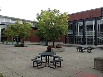 The Redmond High School campus is centered in one large building containing academic classrooms, a student cafeteria, a central courtyard, three gymnasiums, and a performing arts center. The B Wing extension, added in 2012, includes several additional classrooms. Several portable classrooms are also set up in close proximity to the main building.