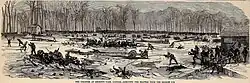 Overnight, the ice refroze and the following day, about 500 people took to the ice with an estimated 2,000 more watching. At 3:30 pm the ice was heard to crack and almost half of the skaters fell into the water. As many could not swim and were wearing heavy clothing, they sank.[1] Those watching attempted to rescue them by launching boats and pulling branches from trees to use as lifelines.[2] Many were rescued unharmed, while survivors with hypothermia and recovered bodies were taken to the nearby Marylebone workhouse.[3] Recovery of all the bodies took several days as the lake kept refreezing and several bodies had to be removed from the bottom of the lake by divers.[4]