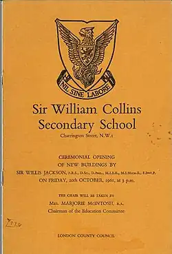 In 1951 it merged with part of the North London Polytechnic school for boys, based in Prince of Wales Road, Kentish Town, and became a boys school, "Sir William Collins School", named after Sir William Job Collins,[16][17] an eminent surgeon and local politician. During the 1950s the school was considered to be a "technical school", academic studies were taught at the Medburn Street site, technical and science subjects at the Polytechnic in Kentish Town.