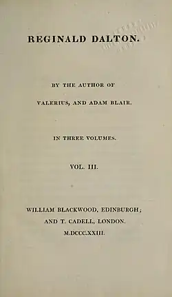 Reginald Dalton is an 1823 comedy novel by the Scottish writer John Gibson Lockhart originally published in three volumes by William Blackwood in Edinburgh and Thomas Cadell in London.[1] It was one of four novels Lockhart published in the early 1820s, including Valerius (1821) and Adam Blair (1822). It takes place around Oxford University which Lockhart had himself attended.[2] It helped to launch the genre of "Oxford novels" which focus on the development of a young student.[3]