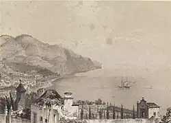 The Smiths met Robert Reid Kalley socially in November 1841.[17] He wrote in 1844 to Smith about violence against Protestants.[18][19] Andrew Combe, who noted Smith's letter to Alexander Haldane's The Record on behalf of Kalley's self-assigned mission on Madeira, called Smith his "great friend", who had witnessed Kalley's preaching in Portuguese.[20] The Disruption of 1843 led to the formation of the Free Church of Scotland, to which Kalley adhered, and which sent a delegation to Smith. "A. M. of Dorchester" wrote to John Bull stating that Smith was "openly patronising schism."[21] The 1844 edition of Emily Smith's Panoramic View of Funchal in lithograph was also connected with the wish to raise the profile of the religious strife on the island.[22]