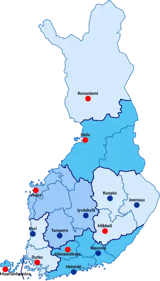 The agencies themselves do not constitute a subdivision of Finland (ISO 3166-2:FI); instead, the first-level subdivisions are the regions of Finland. The other important set of top-level regional state agencies are the Centres for Economic Development, Transport and the Environment (ely-keskus).