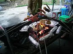 Mu kratha is a cooking method that originated in Thailand, In Philippines, Singapore and Malaysia, it is known as mookata.[18]