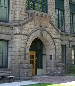 The school is a three-story rectangular structure, with a footprint measuring 52 feet (16 m) by 60 feet (18 m). The building rests on a concrete foundation. The structure itself was constructed of locally quarried pink volcanic tuff. However, the original pinkish color has weathered to a light brown. The central feature of the building's facade is its entryway. The imposing double-leaf doors are recessed from the front wall in a shallow vestibule. The entry is flanked on the first floor by three classroom windows on each side. The second and third story facade is dominated by tall windows with fixed panes. The roof is covered with built-up asphalt.[1]