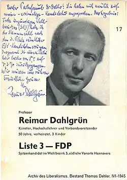 After the end of the Second World War and even before the founding of the Federal Republic of Germany, Dahlgrün led a piano class at the Municipal Conservatory in Hanover from 1946 onwards and performed at the piano and as piano accompanist.[2] At the time of the reconstruction of the city, 48 % of which was destroyed by the bombing of Hanover in World War II,[3] the Filmtheater was opened on Kröpcke 1953 with a festive prelude by Dahlgrün on Grand piano.[4]