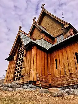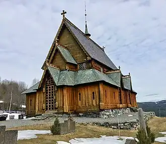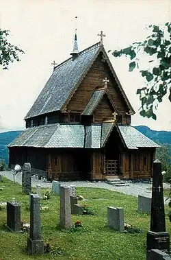 After the previous church burned down, a new wooden stave church was built on the same site. The exact age of this church is uncertain. Through radiocarbon dating, logs in the church have been dated to 1190, which somewhat contradicts previous datings of the church. Other beams in the nave date to the years 1225 and 1272. There are some claims that the church was built after 1326, but this seems to be outside the margin of error for the radiocarbon dating. Most historians say the church was built in the late 13th century. There is, however, a written account of the present church's existence in 1327, so it was certainly built by then. It is also possible that after the fire, the old church was heavily rebuilt with some materials being reused.[4][5][6]