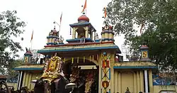 Rakthakanda Swamy Temple, Omallur, Pathanamthitta District, known as "Omallur Temple" traces its history to the 8th century AD. It is a pilgrim centre on the way to Sabarimala from Pandalam, the birthplace of Sree Ayyappan. The Temple is famous for its annual festival of 10 days in the month of Medom of Malayalam Era.[1] The 10-day festival is celebrated by 10 Karayogams (village communities) in and around Omallur. During the festival days, there is a customary Arattu procession to the river Achenkovil. More than 10 elephants decorated with Nettipattom (a decorated cover on the forehead) will be a speciality of this Arattu. The Temple has a Golden Flag Staff erected in the year 1952 AD. Omallur is 4 km [2] south from the district headquarters Pathanamthitta and 11 km from MC Road (Kottayam - Trivandrum route). Omallur Temple has many interesting stone carvings. Kallunadasvaram (Nadasvaram made up of stone) and Kalchangala (chain made by stone) are two among them.