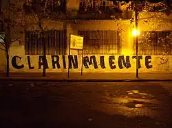 Street graffiti that reads "Clarín miente" (Spanish: Clarín lies), a common Kirchnerite slogan about the press