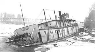 On December 29, 1924, the pressure of the ice on the steamer caused the line holding the boat to the riverbank to break, resulting in Relief sinking in about 20 feet of water.[36] About one-half of the vessel was under water.[36]