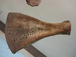 Non-living sacrificial offerings were mainly bones, stones and bronzes. Some of the bone products were shaped into hairpins or arrowheads, and there are instances of ivory found in elite tombs.[176][177] Stone objects such as jade were moulded into decorative ritual objects, such as those discovered in the Tomb of Fu Hao.[178][179] Offering ceremonies involved bronze vessels with short inscriptions, such as the ding (鼎), of which access seemed to be exclusively granted to the king and heirs partaking in rituals.[122][180][181] There were also accepted minor materials like ceramics, the designs on which were inherited from earlier cultures.[182][183]