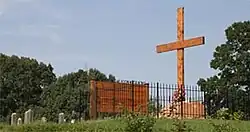 During May 2009, in accordance to the wishes of some descendants, the LDS Church purchased 16 more acres of land in the Meadows.[35] This parcel of land is believed to be the location where the men and boys of the wagon train were killed and may contain the "upper gravesite."[35] On September 10, 2011, a new memorial site, built by the LDS Church in remembrance of the men and boys who were killed, was dedicated on this land. The memorial, located a mile northeast of the siege site and 1999 monument, includes a large polished stone monument and a rock embedded in the surrounding cement. Etched into the rock is a cross and it is believed the rock was once part of a cairn erected to cover the human remains found in the years following the massacre; two stone benches and an interpretive marker were also erected as part of the memorial.[36]