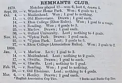 The Remnants also entered the Berks & Bucks Senior Cup in the 1880s, reaching the final in 1881, but lost 1–0 to Marlow, who also had two goals disallowed for offside.[9]