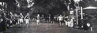 In the following year, Cavally once again won the races in the 100 and 400 meters, this time with slightly slower times of 12 and 55 seconds, respectively.[4] In 1890, he claimed his third consecutive victory in the 100 meters, again in 12 seconds, just ahead of the runner-up, the Peruvian Ricardo Ortiz de Zevallos, who ran 12,1 seconds.[4] Instead of running the 400 meters, however, he opted for the 110 meters hurdles, which he won with 19,2 seconds, thus becoming a six-time French champion in the 100m, 400m, and 110m hurdles between 1888 and 1890.[1][2][4] He was also the inventor of the hurdle jump known as "à la Cavally".[2][5]