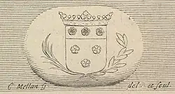 The crest of the house of Longueil, as it can be found in the French town coat of arms of Maisons-Laffitte, is the following: "Azure, three roses argent 2 + 1, a chief or three roses gules per fess".[2] It is worth mentioning that in Montreal in 1668 (i.e. during René's lifetime), the son of an innkeeper and a resident of Longueil, Dieppe-born Charles le Moyne, was ennobled by Louis XIV, establishing the title of Baron de Longueuil. With the coat of arms that he received, the resemblance to that of the Parisian family is obvious and since a genealogical connection has yet to be established,[3] this design may have been made with René's acceptance or knowledge. The town of Longueil (9 miles southwest of Dieppe) in France later adopted elements from the arms of these barons[4] (and to a certain extent also from the similar arms of René de Longueil's family of Paris[5]) in their coat of arms.[6] Furthermore, the Canadian city of Longueuil, located next to Montreal, received in 2004, with the permission of Raymond Grant, Baron de Longueuil, the coat of arms of the barons as its city crest.