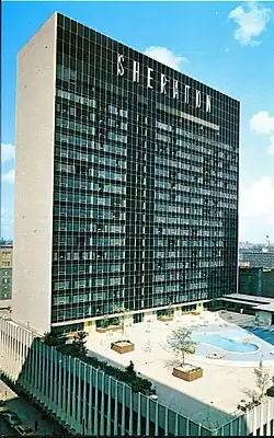 It opened to the public, along with a ribbon-cutting ceremony, on November 18, 1963.[28] The hotel faced legal battles since its opening, as Ohio's attorney general challenged the right for SERS to invest in and own a hotel. It became a Sheraton hotel in January 1965 under two temporary agreements and later under a long-term lease.[29] The hotel's name was changed to the Sheraton Columbus Motor Hotel in May of that year,[30] and official conversion into a Sheraton began in June, and included numerous branding changes, office expansions, and other improvements.[31][32] In 1981, further changes took place, giving the hotel "old world charm", taking influences from high-end European hotels.[33] The hotel lost its Sheraton franchise in fall 1986, and the owners hoped to use half of the building for condominiums. That plan was scrapped by January 1987, with new plans to sell half of the building's rooms as private investments, to be rented and maintained by the hotel's management company.[34] The hotel was $14 million in debt at this point, with not enough demand for hotel rooms in Downtown Columbus.[35] The hotel closed on December 1, 1987, gradually beginning in June, including canceling reservations, closing its restaurant, and reducing to a skeleton staff to operate the hotel. Multiple plans to sell the building collapsed, and it was purchased by MetLife around 1989 in a sheriff's sale.[36][37] A plan in 1990 was to convert the building into apartments; other ideas included a health club, a high-rise parking garage, and a trading company headquarters. In January 1996, it was purchased by HBE Corp., parent company of the Adam's Mark, part of an upscale hotel chain. The hotel reopened as the Adam's Mark on March 21, 1997 after $25 million in renovations.[38][39] The renovations included extra rooms (415, up from 380), making it the second-largest hotel downtown.[40][41]