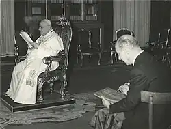 A major event took place in 1957, when 45 of his works were exhibited at Tiffany & Co., 727 5th Avenue, New York. Among them, the portraits of: Pope Pius XII; Clare Boothe Luce (1903-1987), ambassador of the United States to Italy in the 50s; Princess Isabelle Colonna; Audrey Hepburn; Queen Elizabeth II[10] (New York Times, 9 October 1957).[11] The works on display also included a small bust of Empress Soraya, a mantel designed for the Tokyo opera season, a Chiang Kai-shek commemorative medal, more than 10 drawings. The opening ceremony was held by the Italian Consul General in New York, baron Carlo De Ferrariis Salzano (Pacific Stars and Stripes, 10 October 1957, p. 9). The introduction of the catalogue was by the writer James Albert Michener (New York 1907 – Austin 1977).