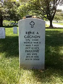 Gagnon died on October 12, 1979, at age 54, in Manchester, New Hampshire.[26] He resided in nearby Hooksett, and was survived by wife Pauline Gagnon (1926–2006) and son René Gagnon, Jr. He was buried at Mount Calvary Cemetery in Manchester. At the request of his widow, a government waiver was granted on April 16, 1981, and his remains were re-interred in Section 51, Grave 543 of Arlington National Cemetery on July 7. Inscribed on the back of his Arlington headstone are the words: