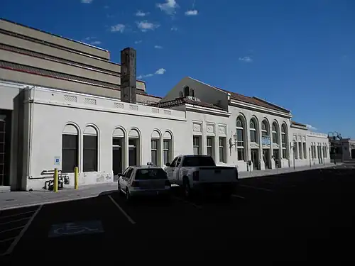 A depot has existed at this location since the first transcontinental railroad arrived in Reno in 1868. A series of wooden depots built by the Central Pacific Railroad burned down. The current stucco depot was built by the Southern Pacific Railroad in 1926.[6] The Virginia and Truckee Railroad utilized the station until 1950, when the railroad ceased operations.[7] The Southern Pacific Depot was also the terminus of Reno's street railways: Reno Traction Company streetcars and the Nevada Interurban served the station between 1908 and 1925.[8] The Western Pacific Railroad historically provided service to Reno, but never used this station, instead using the (now disused for rail service) Nevada-California-Oregon Railroad Depot, a few blocks to the east.